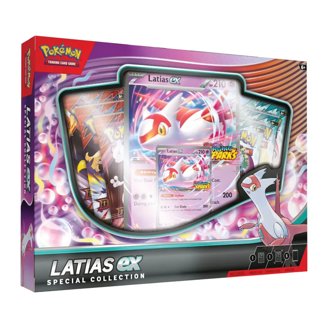 Fly ahead with the Pokemon TCG: Latias ex Special Collection. This box brings a playable Latias ex foil promo and a jumbo Latias ex promo for display, plus six booster packs divided between Destined Rivals and Journey Together so you can chase fresh hits, trade extras, and tune decks fast.