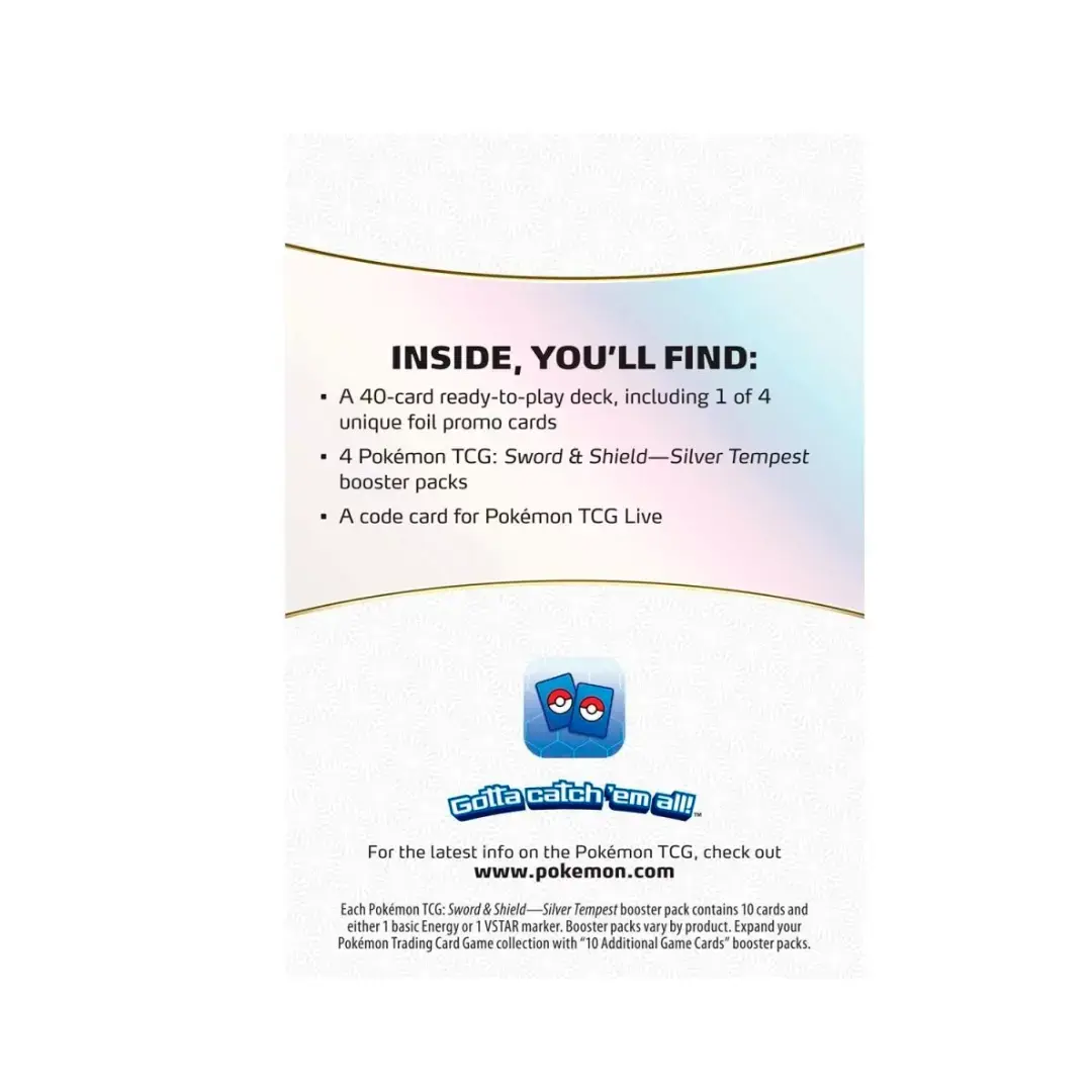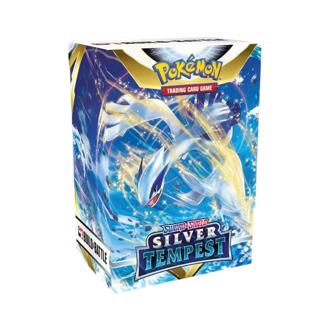 The Pokemon TCG: Silver Tempest Build & Battle Box includes a ready-to-play 40-card deck, a stamped promo, and 4 booster packs for customising your build.