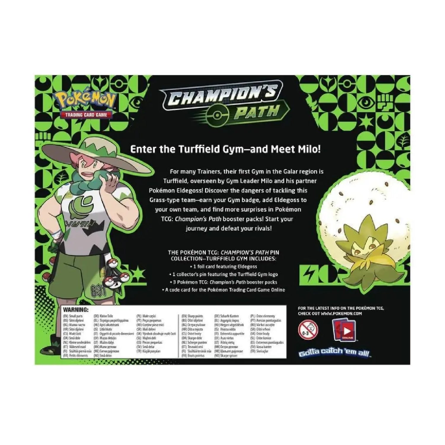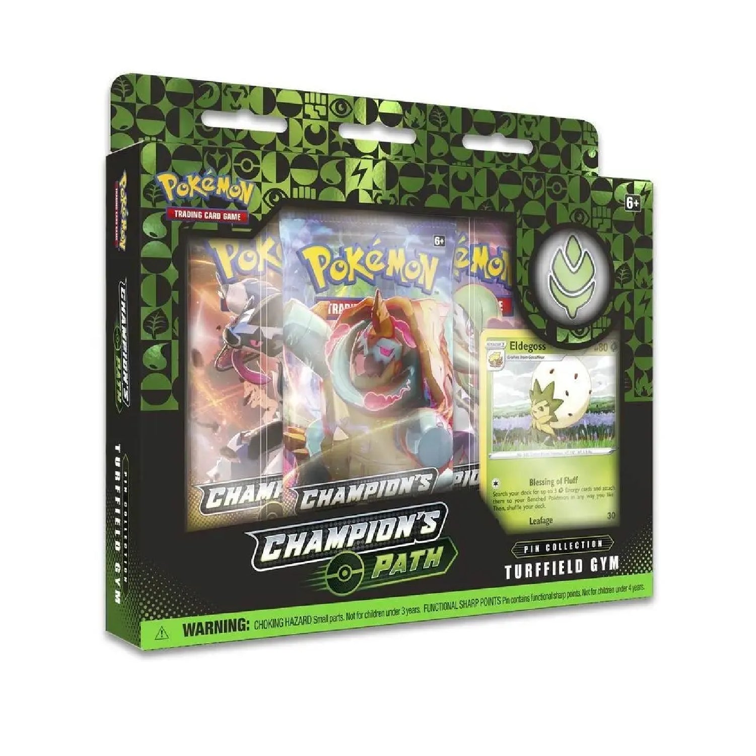 Go Grass themed with the Pokemon TCG: Champions Path Pin Collection Turffield Gym. Includes a foil Eldegoss promo, the Turffield Gym pin and three Champions Path boosters.