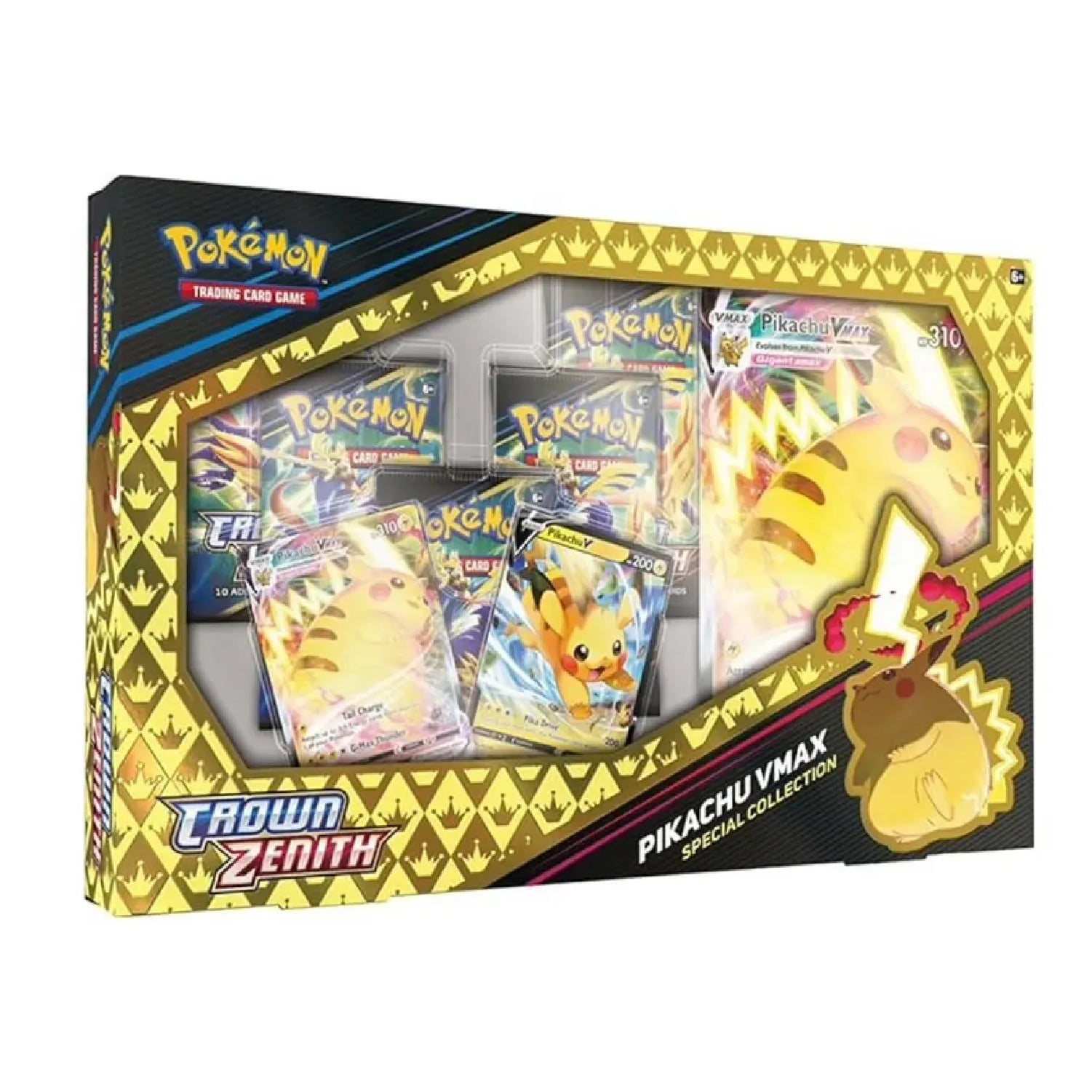 Go big with the Pokemon TCG: Crown Zenith Special Collection (Pikachu VMAX). Features an etched Pikachu VMAX promo, a Pikachu V to bring it into play, an oversize VMAX and five Crown Zenith boosters.