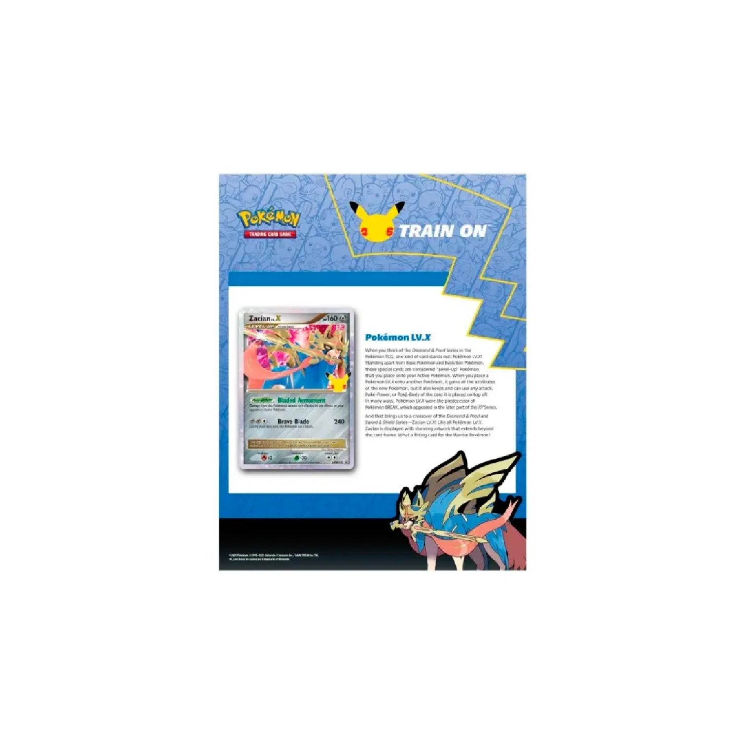 Relive Diamond and Pearl era mechanics with the Pokemon TCG: Celebrations Deluxe Pin Collection. It includes a foil Zacian LV.X promo and a deluxe enamel pin that flips between Flying Pikachu and Surfing Pikachu, plus Celebrations boosters.
