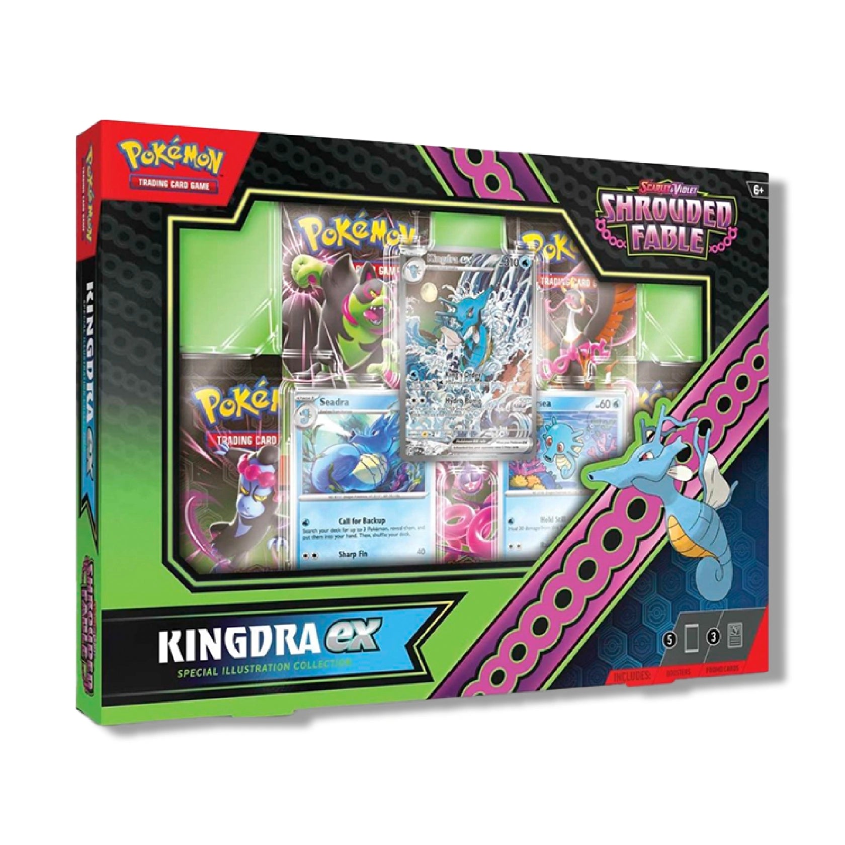 Add stunning artistic flair to your Pokemon TCG collection with the Scarlet & Violet - Shrouded Fable Special Illustration Collection! This collection showcases a special illustration rare-style promo card featuring either Kingdra ex or Greninja ex. Each set also includes foil cards of the Pokemon's full Evolution chain, along with several booster packs from the Shrouded Fable expansion to further enhance your deck. One collection is chosen at random, making each purchase a delightful surprise!