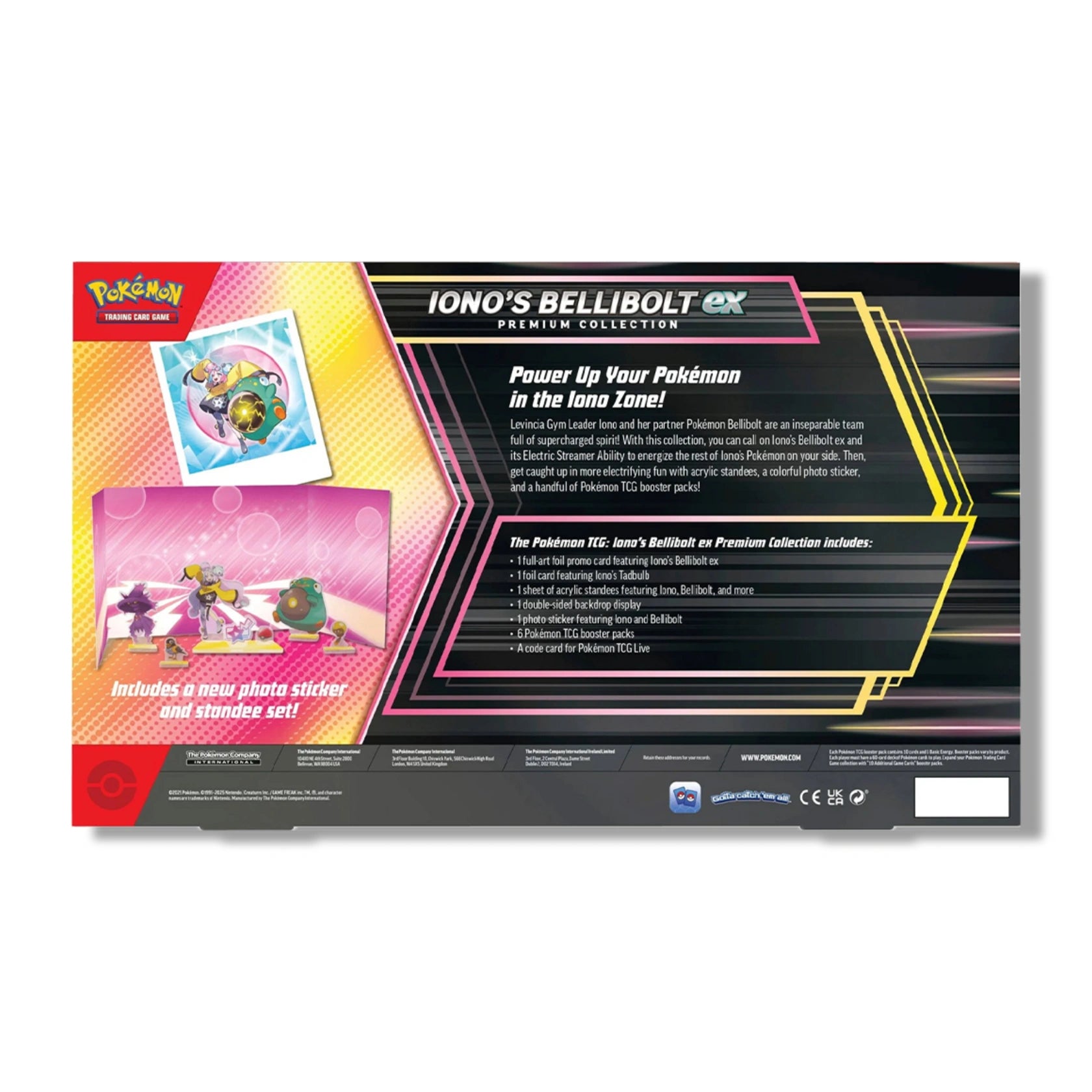 Charge up your team with Bellibolt ex's Electric Streamer Ability, backed up by Iono's Tadbulb, and showcase your fandom with a set of acrylic standees, a photo sticker, and a double-sided display backdrop.