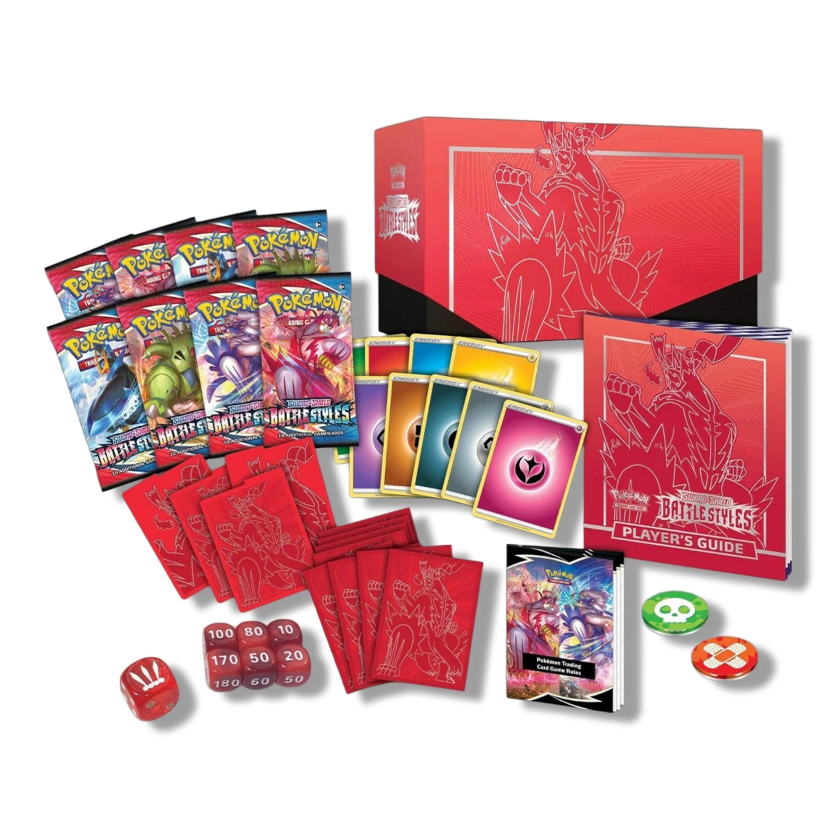 Load up with the Pokemon TCG: Battle Styles Elite Trainer Box (Single Strike Urshifu). Open 8 booster packs and kit out decks with Single Strike sleeves, dice, markers and Energy for heavy-hitting lines.