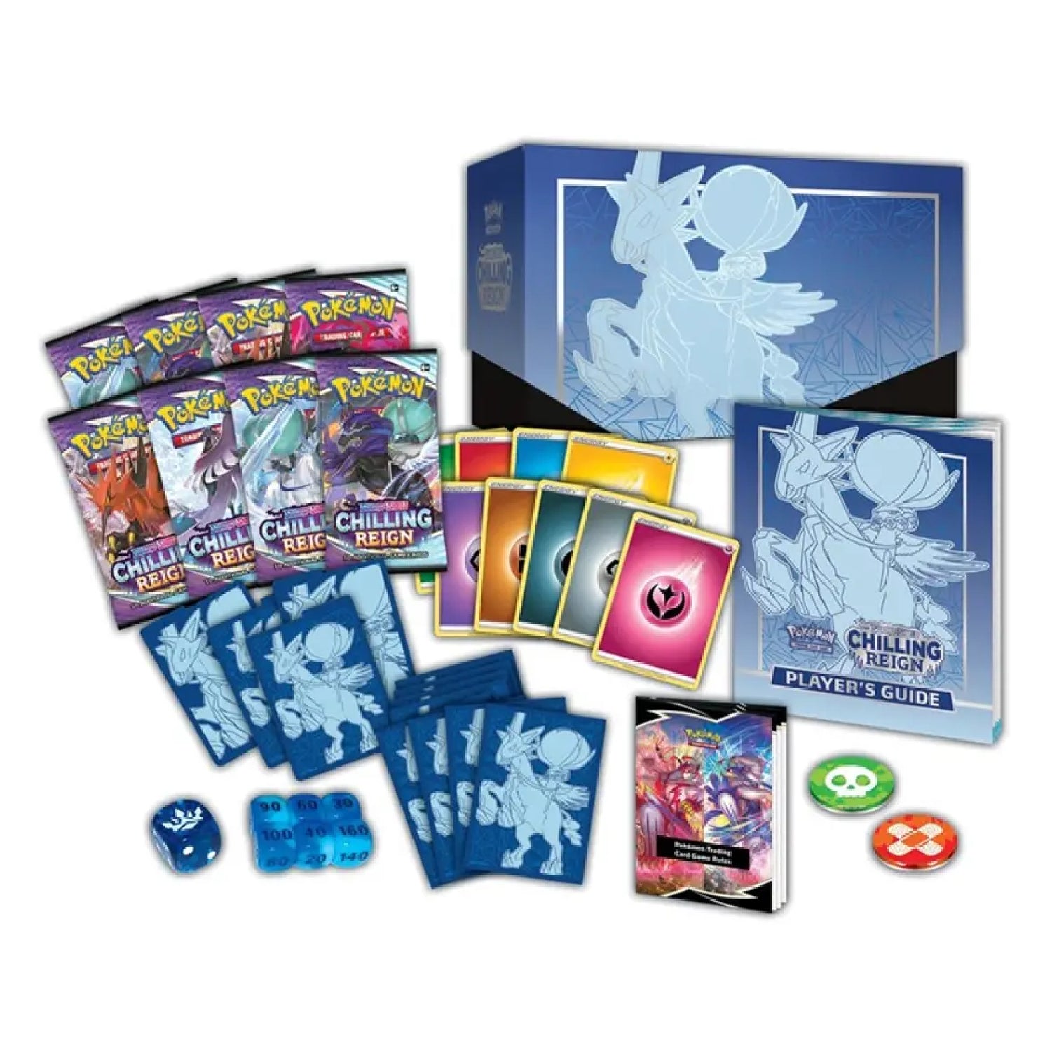 Open the Pokemon TCG: Sword & Shield - Chilling Reign Elite Trainer Box with headliners Ice Rider Calyrex VMAX, Shadow Rider Calyrex VMAX and the Galarian Legendary Birds. Equip sleeves, dice and markers alongside 8 Chilling Reign booster packs.