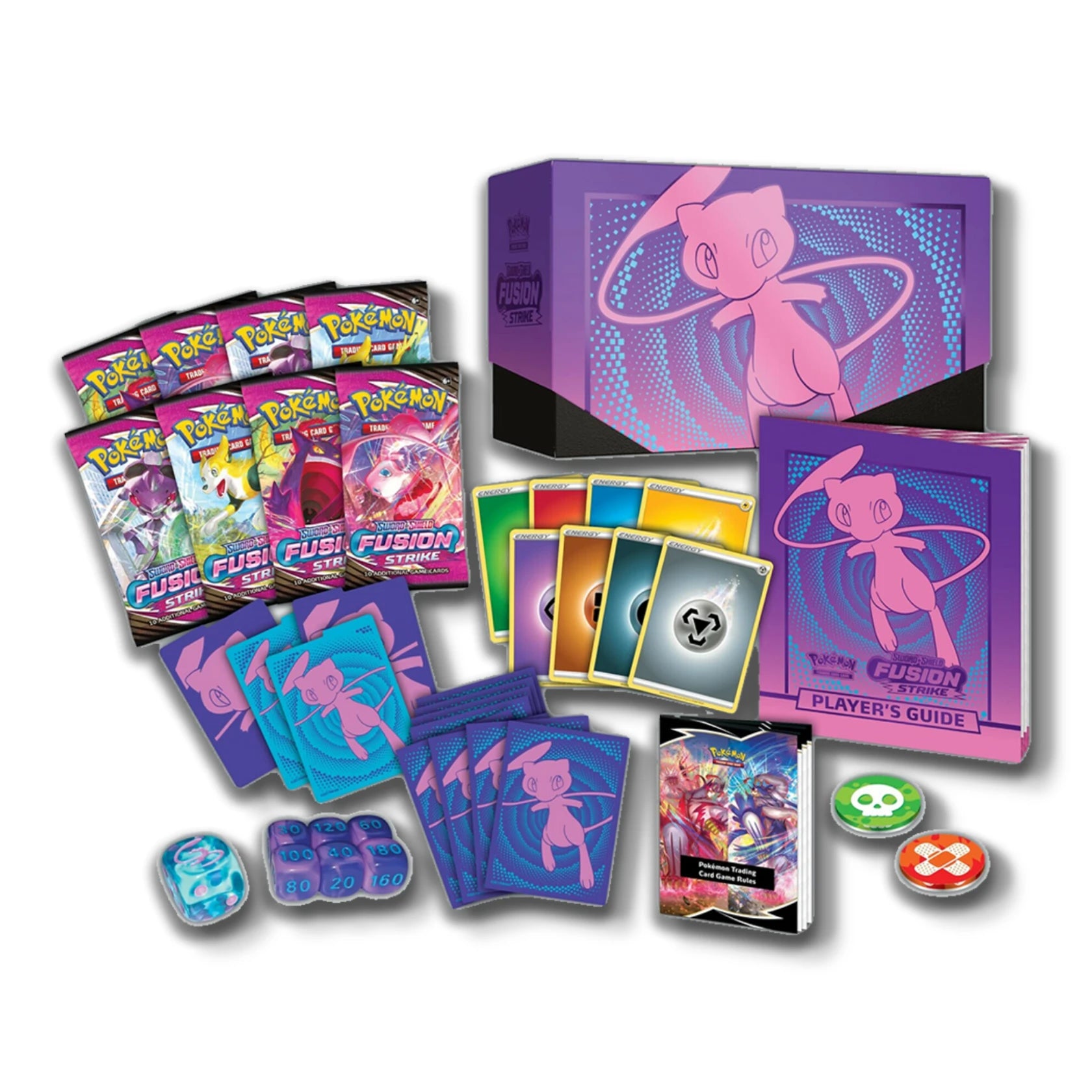 Equip for openings and play with the Pokemon TCG: Fusion Strike Elite Trainer Box. Inside are 8 booster packs, Mew sleeves, Energy, dice, markers, a rulebook and a player's guide to the set.