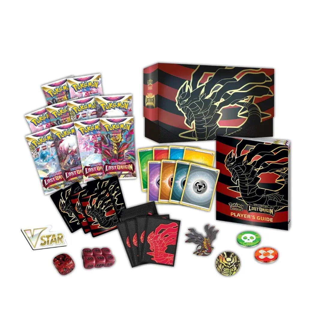 Equip for openings and play with the Pokemon TCG: Lost Origin Elite Trainer Box. Inside are 8 booster packs, Giratina sleeves, Energy, dice, markers, a rulebook and a player's guide to the set, plus a VSTAR marker for modern play.