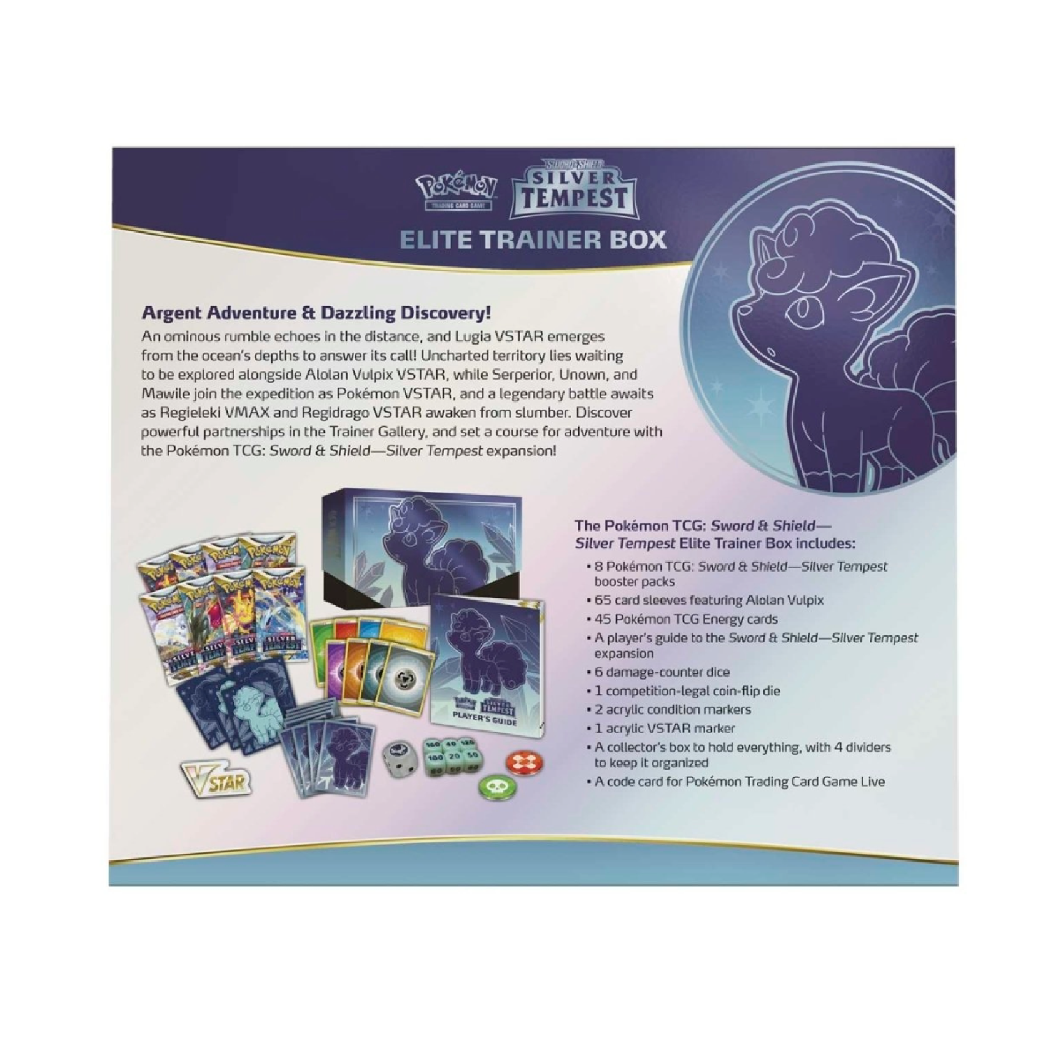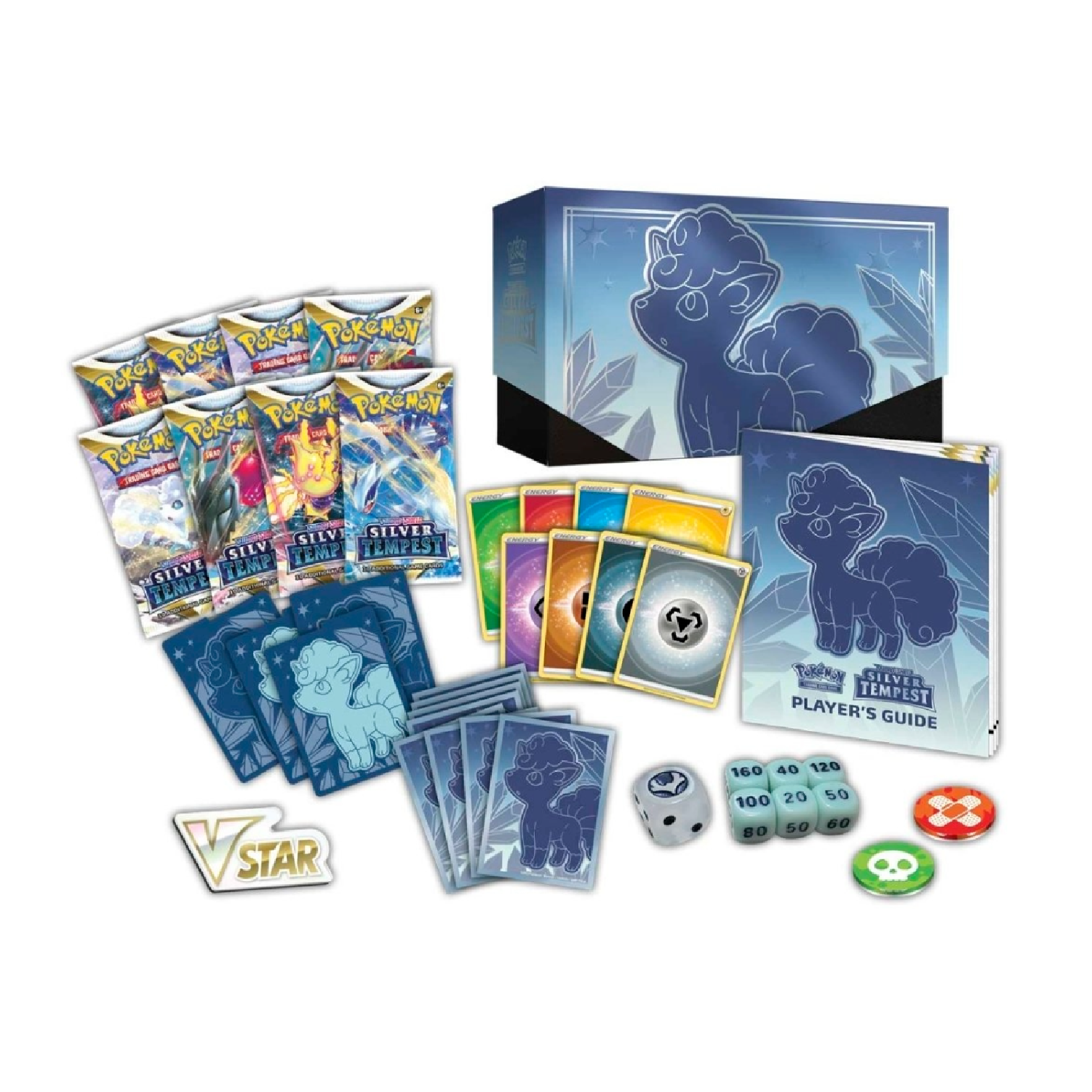 The Pokemon TCG: Silver Tempest Elite Trainer Box is a complete bundle for players and collectors. Featuring Alolan Vulpix art, it includes 8 booster packs, sleeves, dice, and more.