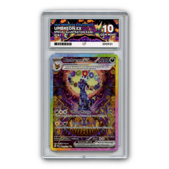 Dive into darkness with the stunning Umbreon EX Special Illustration Rare from Prismatic Evolutions. Graded ACE 10, this full-art card showcases Umbreon’s iconic design and mystique, perfectly preserved for collectors and fans of the beloved Dark-type Pokémon.