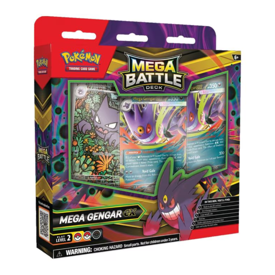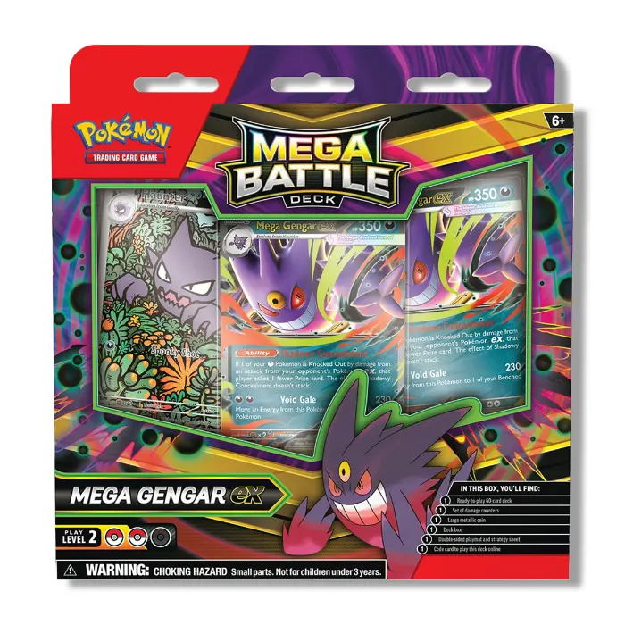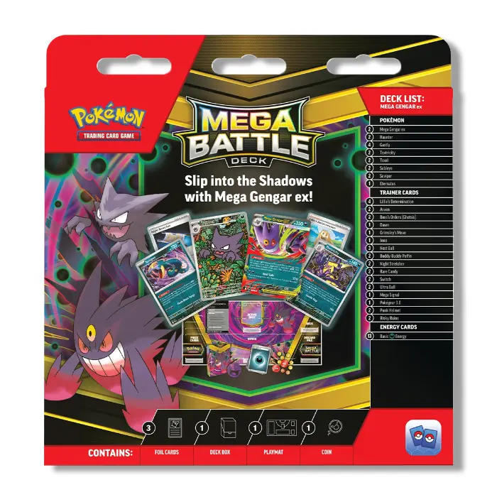 Step straight into a match with the Pokémon TCG: Mega Battle Deck. Strike from the shadows with Mega Gengar ex. Each deck is a complete 60-card list that teaches core strategy while showcasing a headline Pokémon ex.