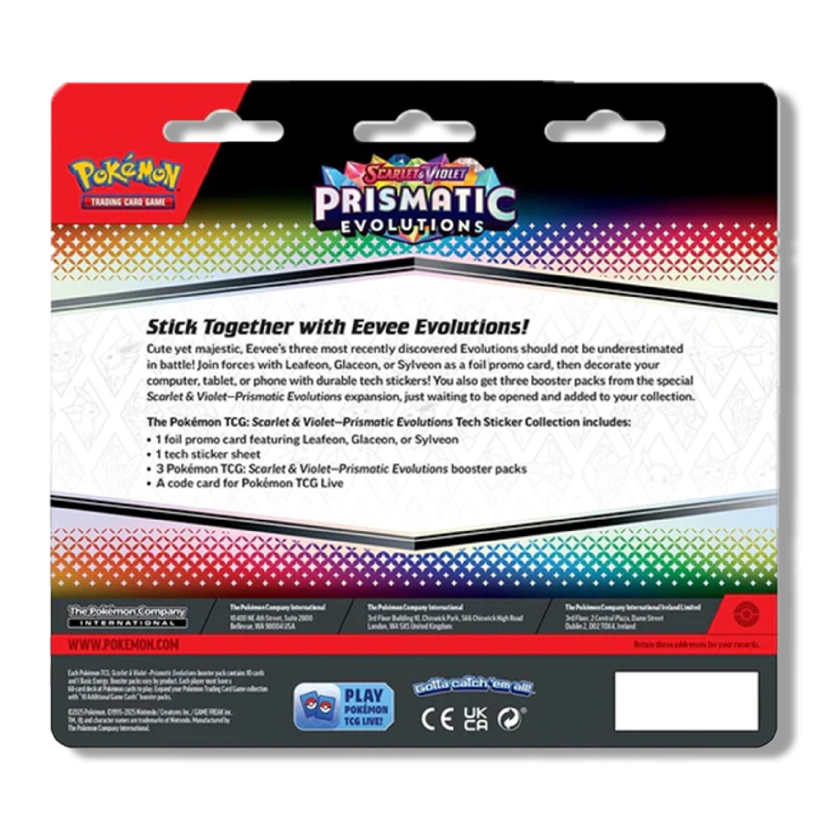 Show off Sylveon, Leafeon, and Glaceon with the Pokemon TCG: Prismatic Evolutions - Tech Sticker Art Set Bundle. You get three Tech Sticker Collections, each with a foil promo and a themed sticker sheet, plus nine total Prismatic Evolutions booster packs to grow your collection across one of the most collectible Scarlet and Violet sets.