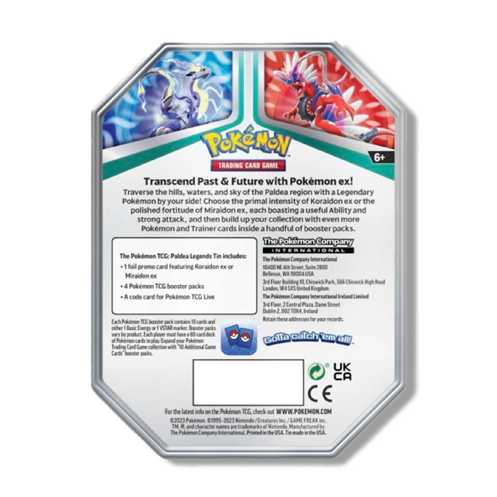 Embark on an exciting journey through the Paldea region with a Legendary Pokemon by your side! The Pokemon TCG: Paldea Legends Tin features either Koraidon ex or Miraidon ex, each boasting a powerful Ability and strong attack to enhance your gameplay! Build up your collection with even more Pokemon and Trainer cards inside a handful of booster packs!