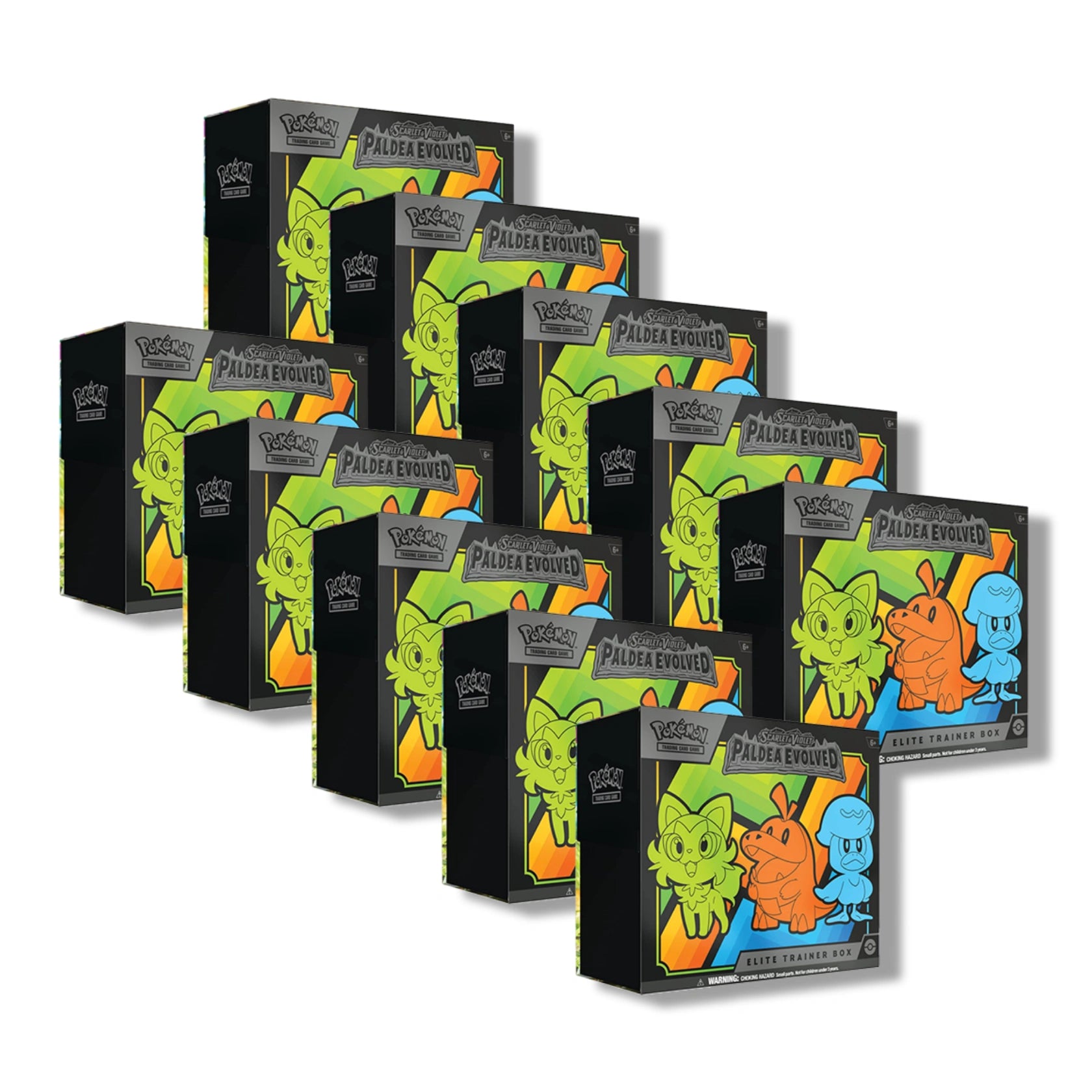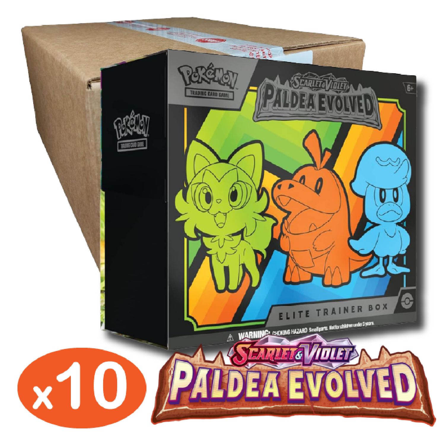 Unleash legendary powers with the Scarlet & Violet: Paldea Evolved Elite Trainer Box [Sealed Case]! This factory-sealed case contains 10 Elite Trainer Boxes, offering a total of 90 booster packs from the Paldea Evolved expansion to enhance your Pokemon TCG collection.