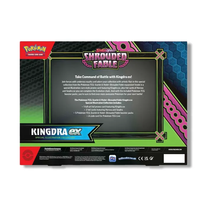 Add stunning artistic flair to your Pokemon TCG collection with the Scarlet & Violet - Shrouded Fable Special Illustration Collection! This collection showcases a special illustration rare-style promo card featuring either Kingdra ex or Greninja ex. Each set also includes foil cards of the Pokemon's full Evolution chain, along with several booster packs from the Shrouded Fable expansion to further enhance your deck. One collection is chosen at random, making each purchase a delightful surprise!