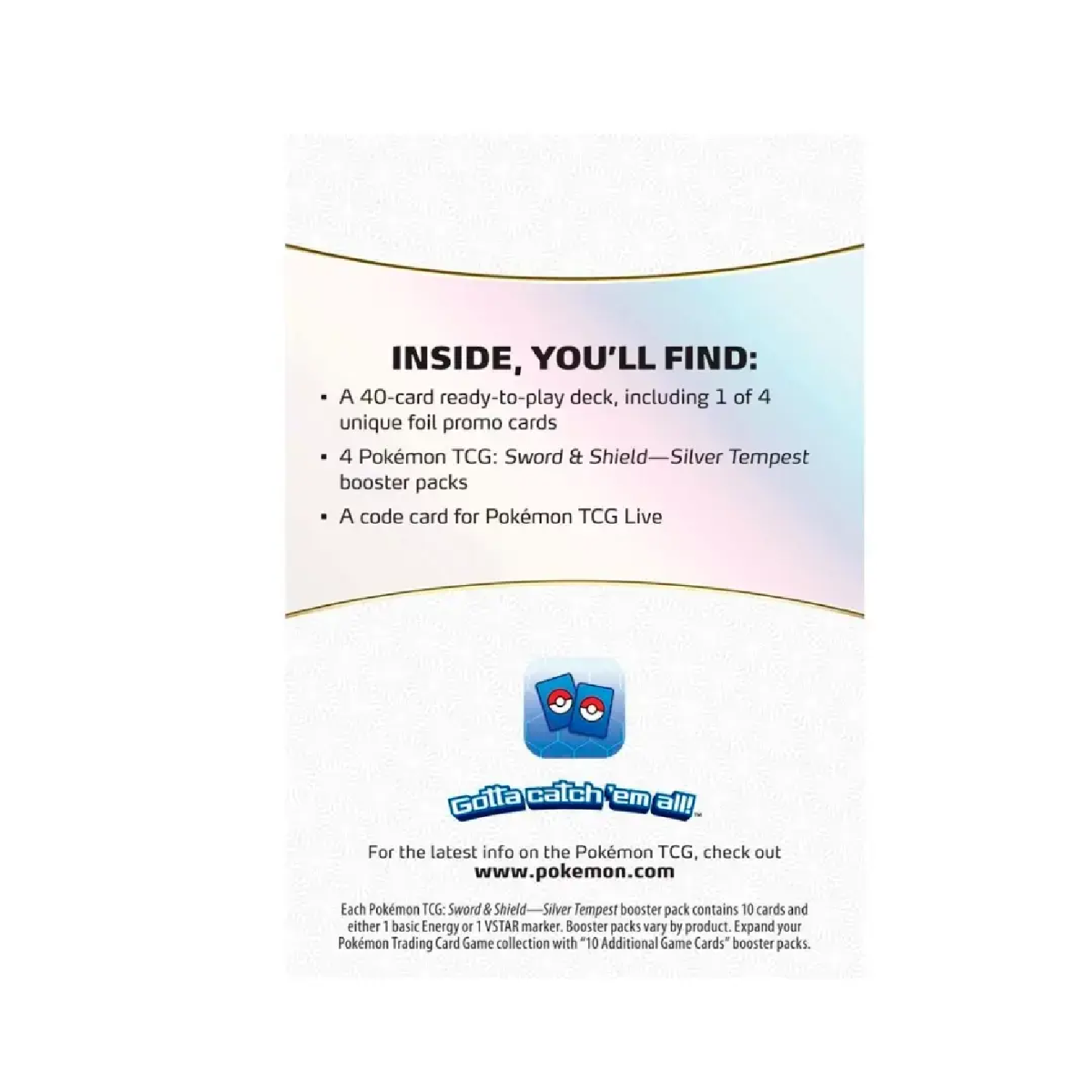 The Pokemon TCG: Silver Tempest Build & Battle Box includes a ready-to-play 40-card deck, a stamped promo, and 4 booster packs for customising your build.